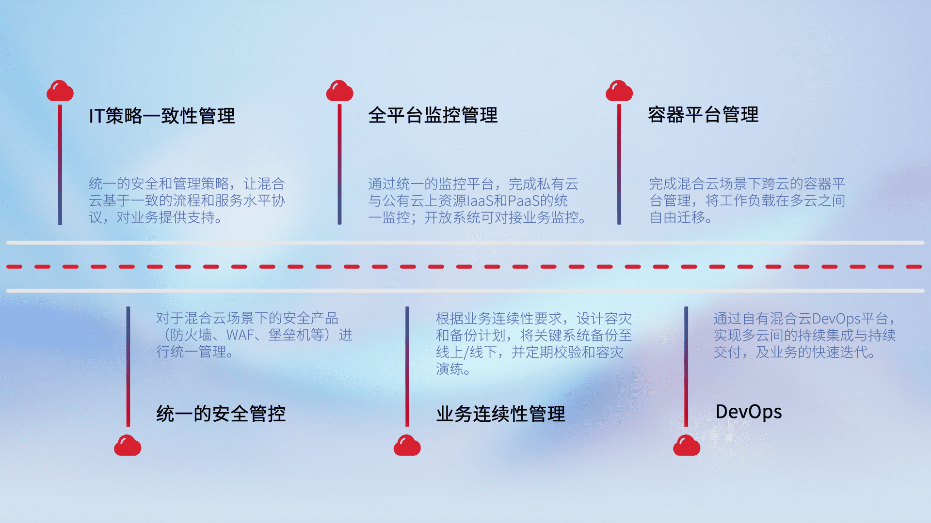 以中立管理模式,,,解决多组织、、、多云、、多运维厂商的复杂关系的管理,,,,保证多云平台资源配置的一致性,,,,实时掌控云资源运行数据。。。。