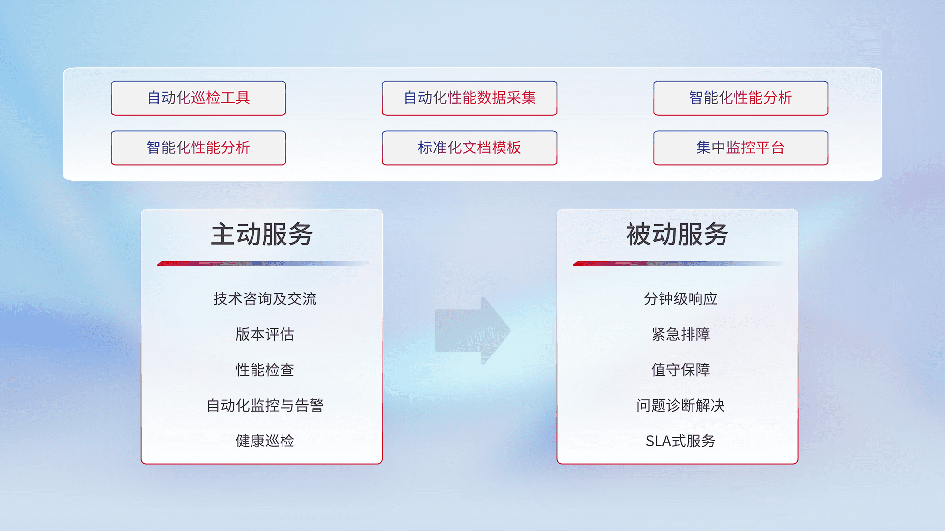 智能化工具和标准化文档,,,保障服务质量,,,提供主动服务(包含技术咨询、、、版本评估、、、、性能检查、、、、自动化监控与告警、、健康巡检)和被动服务包含(分钟级响应、、、、紧急排障、、、值守保障、、、问题诊断解决、、SLA服务)。。。。